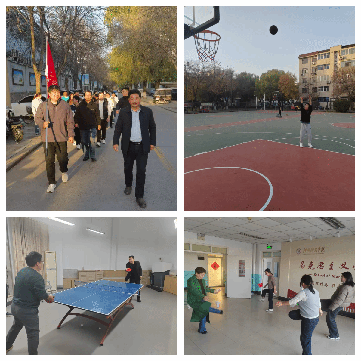11月28日下午和30日下午,学院举行了健步走、乒乓球、踢毽子、篮球赛、定点投篮等系列活动。活动中,老师们积极踊跃参加,现场气氛十分融洽。活动不仅促进了身心健康,还搭建了交流平台,让老师们在运动中放松心情,在互动中增进情谊。