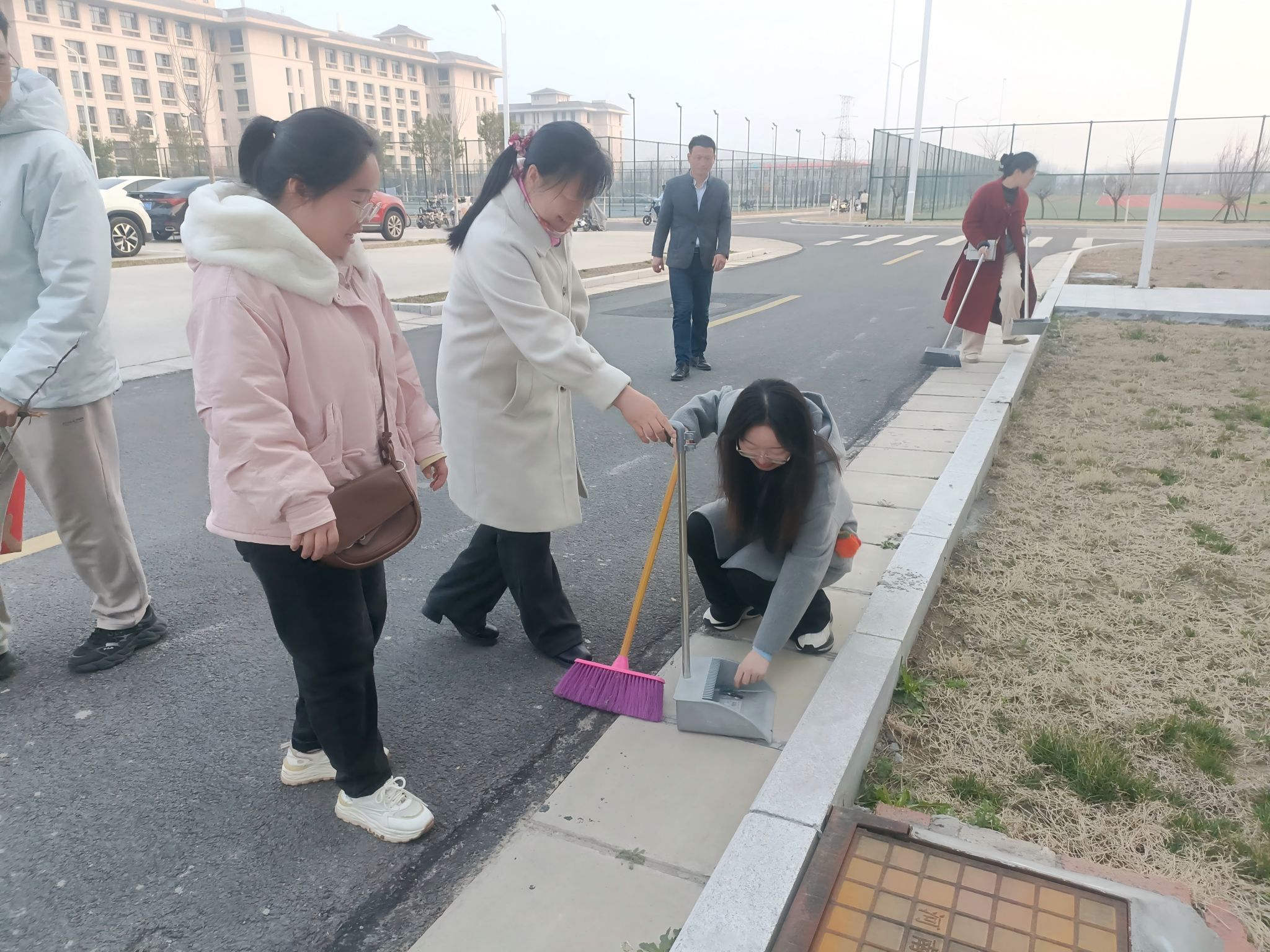 活动中,大家热情高涨、分工协作,手持扫帚、簸箕、垃圾袋等清洁工具,迅速投入到环境整治工作中。老师们细致认真地对责任区内的路面垃圾、落叶杂物进行全面清扫,仔细捡拾绿化带中的白色垃圾、烟头与废弃杂物,彻底清理墙角、绿化带边缘等卫生死角。大家相互配合、默契协作,不放过一处污渍、不遗漏一个角落,用双手为校园“美颜”。