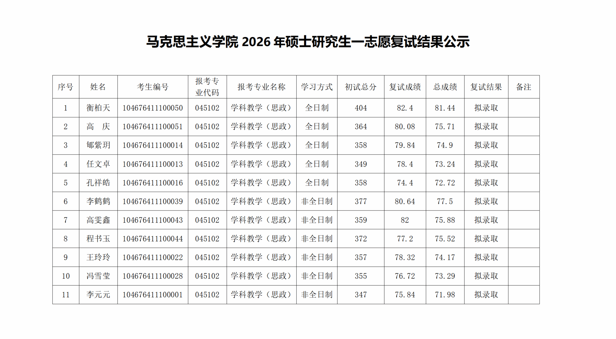 马克思主义学院2026年硕士研究生第一志愿复试结果公示